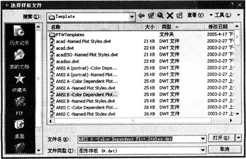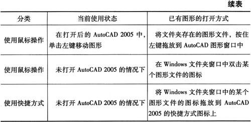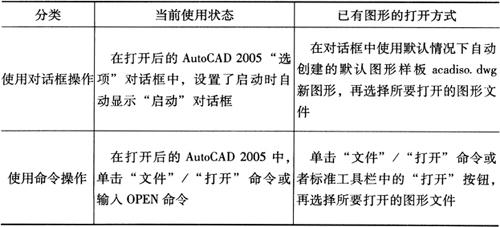 图4-43 “选择样板”对话框 用户可以直接单击“打开”按钮使用默认样板创建新图形,也可以从样板列表中选择一种样板使用,若所需样板文件未在当前样板列表中,可单击“浏览”按钮以查找更多的样板文件。 2.已有图形的打开 若用户需要将已有图形打开继续编辑,则可以使用表4-52中的几种方式。 表4-52 AutoCAD2005中已有图形的打开方式