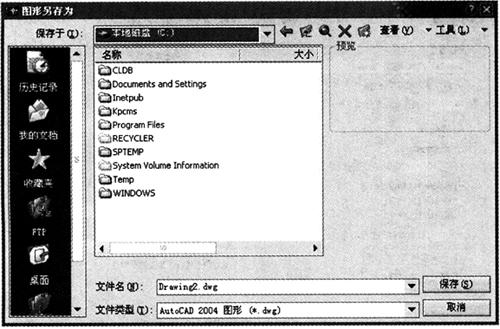 3.绘制图形的保存 完成图形文件操作时,与使用Windows应用程序一样,需要保存图形文件便于以后使用。AutoCAD2005提供了自动保存、备份文件和其他保存选项。 (1)操作保存:需要保存时,可以选择“文件”/“保存”命令,或者直接按快捷键Ctrl+S。首次执行命令时,弹出如图4-44所示的“图形另存为”对话框,指定保存文件的路径后,在“文件名”文本框中输入所要保存的文件名,单击“保存”按钮即可保存当前的图形,并在编辑图形、修改图形的任何时候执行命令,自动以增量方式保存该图形,且在图形文件的保存位置生成一个同名的.bak备份文件。