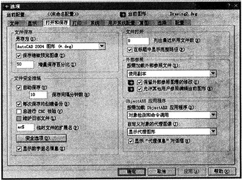 图4-44 “图形另存为”对话框 若用户需要将已经存储的图形换名保存,可以选择“文件”/“另存为”命令,弹出“图形另存为”对话框,指定所要保存的文件位置和名称,单击“保存”按钮即可完成换名保存。 (2)自动保存:为防止AutoCAD运行中遇到死机、停电等意外,系统提供了自动保存功能,选择“工具”/“选项”命令,弹出如图4-45所示的“选项”对话框,进入“打开和保存”选项卡,在“文件安全措施”选项组中的“保存间隔分钟数”文本框中输入适当的时间,若时间太长或太短均起不到自动保存的作用,一般选10min较合适,即选中“自动保存”复选框,单击“确定”按钮完成设置,系统会每隔10min自动保存。