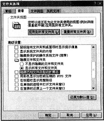 图4-45 设置图形的自动保存 (3)恢复备份:若不慎错误地保存了图形,可使用系统生成的备份文件恢复到保存前的状态,当操作系统为Windows 2000 Professional时,可在文件的浏览窗口中选择“工具”/“文件夹选项”命令,待确保“查看”选项卡中的“隐藏已知文件类型的扩展名”复选框清除(图4-46)后,在文件夹的浏览窗口中,直接将以.bak为扩展名的同名文件的扩展名修改为.dwg,即可在AutoCAD2005中直接打开所要恢复的图形文件。