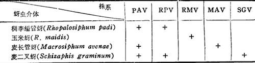 | 释义 | Barley yellow dwarf virus(Oswald & Houstoa) 【又名】: Cereal yellow dwarf virus,Hordeumvirus nanescens,Oat red leaf virus. 【释文】: 文献 Oswald,J.W.& Houston,B.R.(1951).Plant Disease Reptr.35,471;Rochow,W.F.(1970).CMI/AAB.Descriptions of Plant Viruses No.32; Zhang,Q.F.et al.(1983).Plant Dis 67(8).895. 形态与组分 正二十面体,负染粒子直径为20~24纳米,在超薄切片中直径为24纳米。沉降系数115~118S(MAV和RPV株系),A260/A280∶1.92(MAV株系),1.72(RPV株系)。核酸为单链RNA,含量占28%以上(MAV),分子量为2000000(MAV和RPV株系)。衣壳蛋白呈单一组分,分子量为24000,MAV株系为23500,RPV株系为24450。 生物学特性 病毒系统感染大麦(Hordoum vulgare)、小麦(Triticum sativum)和燕麦(Avena sativa)等100多种单子叶植物。大麦、小麦自叶尖向下变成金黄色,燕麦变紫红色。大麦和燕麦可做诊断寄主,冬燕麦可做繁殖寄主。病毒以20多种蚜虫为传毒介体,传毒为持续性。用蚜虫传毒的专一性不同,分为5种不同株系见表B-7。 表B-7 大麦黄矮病毒的蚜虫传毒专一性