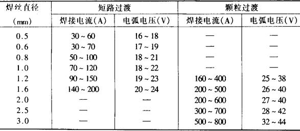 2.焊接电流和电弧电压的选择 CO2焊、焊接电流、电弧电压选择适当,很好配合,才能获得所需要的熔滴过渡形式、稳定的工艺过程和希望的焊缝性能。若焊接电流和电弧电压配合不当,电弧电压过低会造成焊丝插入熔池短路而中断焊接过程。若电弧电压过高则破坏短路过渡或潜弧过渡形式,转为明弧滴状过渡,使飞溅增大、焊接过程不稳。 (1)不同焊丝直径CO2焊常用焊接电流和电弧电压范围见表5-48。 表5-48 不同焊丝直径CO2焊对应的焊接电流和电弧电压