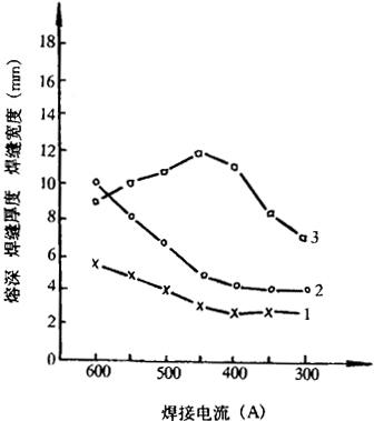 图5-26 焊接电流对焊缝形状的影响 1-焊缝厚度 2-熔深 3-焊缝宽度 (焊丝直径1.6mm、CO2流量20L/min、电弧电压38V、焊接速度70cm/min)