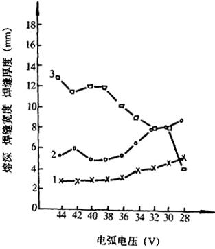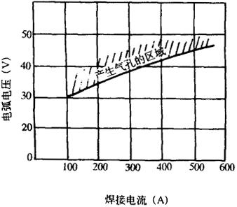 图5-27 电弧电压对焊缝形状的影响 1-焊缝厚度 2-熔深 3-焊缝宽度 (焊丝直径1.6mm、焊接电流450A、焊接速度70cm/miin、CO2流量20L/min) (3)焊接电流、电弧电压对气孔的影响:图5-28是实芯钢焊丝时的实验结果。