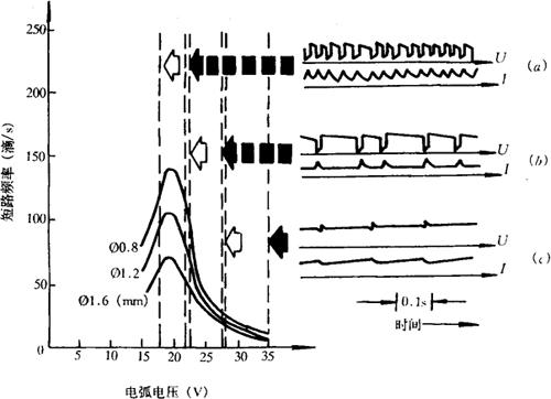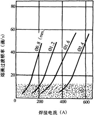 图5-28 焊接电流、电弧电压对气孔的影响 (4)焊接电流对熔滴过渡频率的影响:随焊接电流增加,熔滴过渡频率提高,见图5-29。