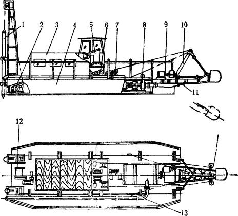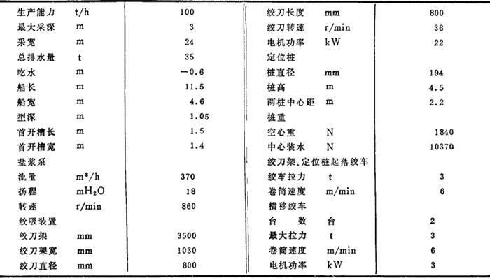 图4-4-6 CY-1型绞吸式采盐船结构图 1-定位桩装置 2-定位桩升降绞车 3-上部船舱 4-船体 5-操作台 6-横移绞车 7-绞刀架升降绞车 8-盐浆泵 9-绞刀装置 10-A型吊环 11-吸盐管 12-电丝卷筒装置 13-压力管道 浮箱分为主浮箱和边浮箱两部分。边浮箱为箱形结构,主浮箱为横骨架式,两者用螺栓联接。盐浆泵、定位桩、起落绞车装在主浮箱内;左右横移绞车装于船甲板左右舷;绞刀架及其起落绞车装在首甲板上,定位桩及滑轮、电缆卷筒设在尾甲板上;变电及操纵台设在架驶室内,操作方便。 (二)CY-1型绞吸式采盐船的性能 1.绞吸式采盐船的性能见表4-4-1。 表4-4-1CY-1型绞吸式采盐船技术性能表