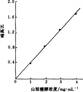 式中 ρρ——检液中的 D-山梨糖醇的浓度,μg/mL V1——样品溶液全量,mL V2——用于制备检液的样品溶液量,mL V3——检液量,mL m——取样量,g (二)气相色谱法 1.原理 用水或乙醇溶液(80%)从样品中提取糖类,用减压浓缩方法将水分全部除去后,制备山梨糖醇衍生物。制备衍生物有TMS和乙酰化两种方法,然后进行气相色谱分析,但TMS化法与甘露糖醇的衍生物分离效果不好,本法用乙酰化法与甘露糖醇的衍生物能完全分开。 2.试剂和溶液 2.1 丙酮。 2.2 乙醚。 2.3 木糖醇。 2.4 内标液 木糖醇在60℃减压干燥后称取400mg,加蒸馏水溶解成100mL。 2.5 吡啶 分析纯。 2.6 无水吡啶 向吡啶中加入氢氧化钠结晶。 2.7 无水硫酸钠 分析纯。 3.测定方法 3.1 样品溶液的制备。 3.1.1 糖质食品:一般准确称取20g以下约含山梨糖醇0.2~0.8g样品,加水50mL,放置过夜,过滤,向残渣中加50mL温水,加热搅拌,然后过滤,合并全部滤液,准确加水成200mL,作为样品溶液。 3.1.2 蛋白性食品:一般准确称取20g以下约含D-山梨糖醇0.2~0.8g的样品,加50mL乙醇(80%),接上冷凝管,加热回流,然后过滤,残渣加50mL乙醇,同样操作后,过滤,合并全部滤液,准确加入乙醇(80%)至200mL,作为样品溶液。 3.1.3 油脂食品:一般准确称取20g以下含D-山梨糖醇0.2~0.8g的样品,加100mL正己烷,激烈振荡,用倾斜法除去正己烷层残渣,加100mL正己烷,用同样方法反复操作。残渣在水浴上加热,除去正己烷,以下按3.1.2同样操作,此液为样品溶液。 3.2 检液的制备 准确吸取样品溶液10mL,放入50mL浓缩器中,准确加入5mL内标液,在60℃水浴上减压浓缩,除去水分,再进一步于60℃水浴上进行减压干燥30~60min,然后加入14mL无水吡啶和7mL无水乙醇,在60~70℃水浴上激烈振摇,使残渣溶解,放置过夜。加水20mL后,用10mL水定量转移到分液漏斗中,用50mL、30mL、30mL乙醚分3次萃取,合并全部乙醚层,用20mLo.1mol/L( 3.3 标准液的制备 山梨糖醇在60℃减压干燥后,准确称取400mg,加水溶解成100mL,作为标准液。分别取此液0、2.5mL、5mL、7.5mL、10mL,加入50mL浓缩器中,然后分别准确加入内标液5mL,以下与“3.2检液的制备”同样操作,作为标准曲线用标准液(1mL分别相当于D-山梨糖醇0,1mg,2mg,3mg,4mg)。 3.4 测定。 3.4.1 测定条件:用具有氢焰电离检测器的气相色谱仪,按下述条件测定。 填充剂:60~80目经硅烷化处理过的硅藻土担体,加入含XE-60(3%)的丙酮溶液,然后蒸去丙酮,干燥; 玻璃柱:玻璃管内径3mm,长度2m; 柱温:从150℃到220℃以6℃/min速度升温; 检测器温度:250℃; 载气:氮气,40mL/min。 3.4.2 标准曲线:分别准确吸取2μL标准曲线用标准液,注入气相色谱仪,由峰高和峰面积绘制标准曲线。 4.分析结果的表述 吸取2μL检液,注入气相色谱仪,根据所得峰高或峰面积,从标准曲线上求出检液中的浓度(mg/mL),按式(11-24)计算样品中的D-山梨糖醇的质量分数(w)。