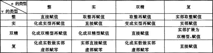 | 释义 | FORTRAN语句 1.赋值语句 形式如下 v=e 其中v为变量名或数组元素。e是一个表达式。不同类型数据的赋值规则见表3.2.2-1。 表3.2.2-1 不同类型数据的赋值规则(v=e)