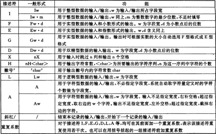 ③格式输入语句 形式一: READ (输入设备号,语句标号)输入项表 语句标号 FORMAT(格式说明) ②FORMAT语句和格式编辑符 FORMAT语句的形式: 语句标号 FORMAT(格式说明) 其中“语句标号”为相应用输入输出语句中引用的标号。“格式说明”由各种格式编辑符组成,各编辑符之间以逗号分隔。常见格式编辑符见表3.2.2-3。 表3.2.2-3 常用格式编辑符