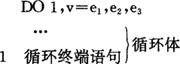 其中1是循环终端语句的语句标号,1后的逗号可省略。v为循环变量名,可以是整型、实型或双精型。e1,e2,e3是算术表达式,分别代表循环变量的初值,终值和增量(又称步长)。当增量为1时,e3和前边的逗号可省略。 DO循环的执行过程见图3.2.2-2。