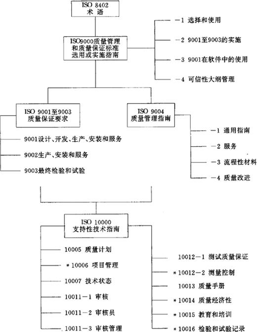 图8.3.3-1 ISO9000族标准构成 (1)术语标准 ISO8402质量管理和质量保证——术语。该标准是阐明质量管理领域所用的质量术语的含意。共67个词条,按照内容的逻辑关系分为四类:基本术语,13个词条;与质量有关的术语,19个词条;与质量体系有关的术语,16个词条;与工具和技术有关的术语,19个词条。 (2)两类标准的使用或实施指南 这类标准的总编号为ISO9000,总标题是质量管理和质量保证,每个部分的标准再加上该分标准的部分号和具体名称。共有四个分标准,目的是为质量管理和质量保证两类标准的选择和使用或如何实施提供指南。 ①ISO9000-1 质量管理和质量保证标准——第1部分:选择和使用指南。本标准阐明了与质量有关的基本概念,并为ISO9000族的质量管理和质量保证标准的选择和使用提供指南。 ②ISO9000-2 质量管理和质量保证标准——第2部分:ISO9001、ISO9002和ISO9003的实施通用指南。本标准是对三个质量保证标准的实施所作的解释,以便对标准中的要求有一致、准确和清楚的理解。由于三个质量保证标准已经修订,并于1994年7月1日正式公布,ISO9000-2(目前为1987年版)正在加快修订。 ③ISO9000-3 质量管理和质量保证标准——第3部分:ISO9001在软件开发、供应和维护中的使用指南。本标准中的软件仅指计算机软件。由于计算机软件的开发和维护过程不同于其他大多数工业产品,因而有必要对涉及软件产品的质量体系提供补充性指南。本标准的目的是为承担软件开发、供应和维护的组织,通过建议适当的控制和方法,采用ISO9001提供使用指南。 ④ISO9000-4 质量管理和质量保证标准——第4部分:可信性大纲管理指南。可信性包括可靠性、维修性和可用性。可信性大纲是用于管理可信性的组织结构、职责、程序、过程和资源。本标准适用于在使用和维修阶段可信性是特别重要的那些硬件和/或软件产品,例如用于运输、电力、通讯和信息服务的产品,主要目的是在从策划到使用的整个产品寿命周期内控制对可信性的影响,以便生产出可靠的和可维修的产品。 (3)质量保证标准 质量保证标准有三个,分别将一定数量的质量体系要素组成三种不同的模式,代表了第二方或第三方的具体情况下对供方质量体系的要求,供方对这些要求必须满足并应予以证实。 ①ISO9001 质量体系——设计、开发、生产、安装和服务的质量保证模式。当需要证实供方设计和生产合格产品的过程控制能力时应选择和使用此种模式的标准。 ②ISO9002 质量体系——生产、安装和服务的质量保证模式。当需要证实供方生产合格产品的过程控制能力时,应选择和使用此种模式的标准。 ③ISO9003 质量体系——最终检验和试验的质量保证模式。当仅要求供方保证最终检验和试验符合规定要求时,应选择此种模式的标准。 (4)质量管理标准 这一类标准的总编号为ISO9004,总标题是质量管理和质量体系要素,每个部分的标准再加上该分标准的部分号和具体名称。这一类的分标准有以下4个。所有这些标准的目的都是用于指导组织进行质量管理和建立质量体系的。 ①ISO9004-1 质量管理和质量体系要素——第1部分:指南。本标准全面阐述了与产品寿命周期内所有阶段和活动有关的质量体系要素,以帮助组织选择和使用适合其需要的要素。本标准适用于生产或提供四种通用类别产品(硬件、软件、流程性材料和服务)的组织。 ②ISO9004-2 质量管理和质量体系要素——第2部分:服务指南。本标准是对ISO9004-1在服务类产品方面的补充指南。供提供服务或提供具有服务成分的产品的组织参照使用。 ③ISO9004-3 质量管理和质量体系要素——第3部分:流程性材料指南。本标准是对ISO9004-1在流程材料方面的补充指南。供生产流程性材料类产品的组织参照使用。 ④ISO9004-4 质量管理和质量体系要素——第4部分:质量改进指南。本标准阐述了质量改进的基本概念和原理、管理指南和方法(工具和技术)。凡是希望改进其有效性的组织,不管他是否已经实施了正规的质量体系,均应参照本标准。 (5)支持性技术标准 这类标准的编号从10000到10020,是对质量管理和质量保证中的某一专题的实施方法提供指南。已经正式公布的国际标准有8个,正在制定中的有4个。 ①ISO10005 质量计划指南。质量计划可用于组织内部以确保相应产品或项目的特殊质量要求,质量计划也可用于供方向顾客证明其如何满足特定合同的特殊质量要求,本标准为供方和顾客在制定、评审、认可和修订质量计划工作中提供指导。 ②ISO10006 项目管理质量指南。 ③ISO10007 技术状态管理指南。技术状态管理是一门管理科学,应用于产品的整个寿命周期。本标准的目的是增进对技术状态管理这门科学的共同理解,促进组织运用技术状态管理来改进他们的工作。本标准为在工业界应用技术状态管理提供指南。 ④ISO10011-1 质量体系审核指南——第1部分:审核。本标准为验证质量体系要素的存在和实施,以及验证体系达到规定质量目标的能力提供指南。 ⑤ISO10011-2 质量体系审核指南——第2部分:质量体系审核员的评定准则。本标准为审核员在所需要的教育、培训、经验、人员素质和管理能力方面提供指南。 ⑥ISO10011-3 质量体系审核指南——第3部分:审核工作管理。任何需经常实施质量体系审核的组织,都应具备对整个审核过程进行全面管理的能力,本标准为此提供了基本的指导。