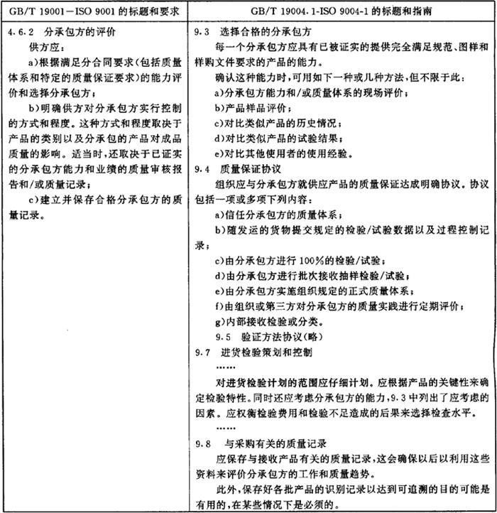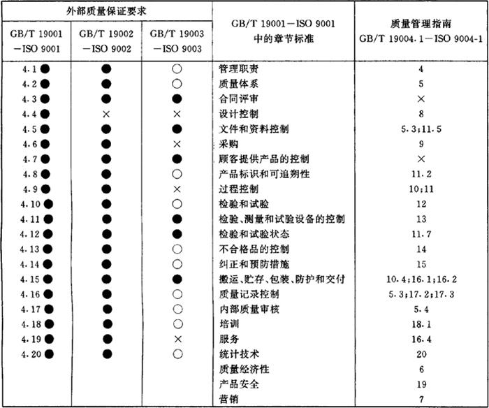 说明:●=全部要求 〇=比GB/T19001-ISO9001和GB/T19002-ISO9002的要求少 ×=不存在该要素 通过对三种模式内容的比较,可以得出,GB/T19001的要求完全包含了GB/T19002,GB/T19002又完全包含了GB/T19003。三种模式中对供方质量体系要求的多或少,反映了不同复杂程度的产品所要求的质量保证能力不同,不应将其理解为质量保证程度的高或低。 ②外部质量保证标准的选择和使用 外部质量保证标准有以下四种用途: a.供方证实其质量体系符合规定的质量体系要求。在合同情况下,供方应向特定的顾客证实其质量体系满足合同中规定的质量体系要求。在第三方认证的情况下,供方应向认证机构证实其质量体系满足所申请的质量保证模式的要求。 b.合同情况下作为顾客与供方之间的质量保证协议。合同中顾客对供方的质量体系要求合适时可以直接引用三种模式中适用的一种;需要时,也可在选定一种模式的基础上进行适当剪裁或提出补充要求。合同中引用哪一种模式以及如何剪裁、补充,应由顾客与供方协商,在对双方都有利的基础上达成一致意见。合同签订后,被引用的质量保证模式标准以及剪裁、补充的要求,将作为顾客对供方质量体系审核的依据。 c.作为合同前评定供方质量体系的准则(属第二方认定或注册的情况)。合同签订前,顾客往往需要评定供方的质量体系,以确定该供方具有满足其订购产品技术要求的能力。评定前,双方应就使用哪一个质量保证标准以及必要时的补充要求作为评定(或认定)的准则达成一致意见。 d.作为第三方认证的依据。在第三方质量体系认证时,供方和认证机构应就使用哪一个质量保证标准作为认证的准则达成一致意见。所选择的模式应适合所覆盖的产品技术要求的需要,并且不会误导供方的顾客。例如,一个组织有设计功能,申请体系认证所覆盖的产品是该组织自行设计的,究竟是选择GB/T19001-ISO9001,还是选择GB/T19002-ISO9002就特别重要。当设计质量对产品质量的形成特别重要,而且在产品检验和试验时又难以充分验证时,应选择GB/T19001-ISO9001。一般来说,一个组织自己设计并制造的产品,最好选择第一种模式的质量体系认证。 在第三方认证的情况下,不适用“剪裁”的概念。“剪裁”是在合同情况下,必要时删去所选质量保证标准中某些质量体系要素或分要素,也包括增加某些要素或分要素。“剪裁”是在特定顾客和供方之间完成的,通过协商达成一致意见后,规定在合同之中。一个组织申请质量体系认证,如果对标准中的某个要素,例如顾客提供的产品,在本组织中不存在这种情况,应在向认证机构提交的质量手册中予以说明。 ③证实符合选定的质量保证标准 为了提供信任,供方有责任证实其质量体系的适宜性和有效性。证实符合所选定的质量保证标准的方法可包括: a.供方的符合声明; b.提供基本的书面证据,例如质量手册; c.提供由其他顾客认定或注册的证据; d.由顾客审核; e.由第三方审核; f.提供经认可的第三方认证的证据。 上述六种方法中的任何一种或他们的组合都可应用于质量体系四种情况中的第2、3、4种,即合同情况,第二方认定或注册、第三方认证或注册,后两种方法适用于第三方认证或注册。具体采用哪一种或哪几种方法应考虑有关顾客、第二方或认证机构的愿望,采用他们认为合适的证实方法。 证实的性质和程度与以下因素有关: a.产品的经济性、用途和使用条件; b.设计产品所要求的复杂性和创新程度; c.生产产品的复杂性和难度; d.仅依据最终检验和试验判断产品质量的能力; e.与产品有关的社会要求; f.供方过去的绩效; g.与顾客的合作程度。 应按具体情况确定证实的程度。例如,对安全性、可靠性有较高要求的产品设计,需要供方提供有关安全性、可靠性分析和评价的证据以及可靠性试验的证据;经多次审核证明供方的绩效一贯很好,再次审核时就可以适当放宽,减少审核抽样的数量,反之则加严。 3.质量管理和质量保证标准的比较 GB/T19004.1-ISO9004-1(质量管理标准)和GB/T19001(质量保证标准)之间,除了目的和应用不同之外,至少还有以下几方面的区别。 (1)质量体系要素不同 表8.3.3-1两类标准的标题和章节号对照表摘自国家标准GB/.T19000.1-ISO9000-1的附录D。为了叙述的方便起见,将该表中间一栏的各个标题,按照习惯说法称作为质量体系要素。表8.3.3-1的中间和右侧这两栏显示了GB/T190004.1-ISO9004-1与GB/T19001-ISO9001质量体系要素的关系。 ①GB/T19004.1比GB/T19001少两个要素,即合同评审和顾客提供产品的控制。 这是因为国际标准ISO9004-1(GB/T19004.1)是作为非合同情况建立内部质量体系而制定的。非合同情况没有顾客对组织(例如企业)的质量体系要求,一个组织是根据市场需求来安排和组织产品的设计和生产的,因此,没有合同评审和对顾客提供产品的控制。 ②GB/T19004.1比GB/T19001多三个要素,他们是质量经济性、营销质量和产品安全。 质量经济性是以财务用语来衡量质量体系的有效性,通过系统的质量财务报告程序报告财务收益,使组织不断降低质量损失和质量成本,获得尽可能高的利润。显然,质量经济性对任何一个组织都是极其重要的。但是,他对与供方订货的顾客来说,却没有直接的关系,质量经济性的高或低,不影响供方向顾客提供合格产品的能力。因此,顾客没有必要评定或审核供方的质量经济性,这就是GB/T19001中没有对这一要素提出