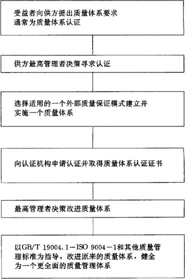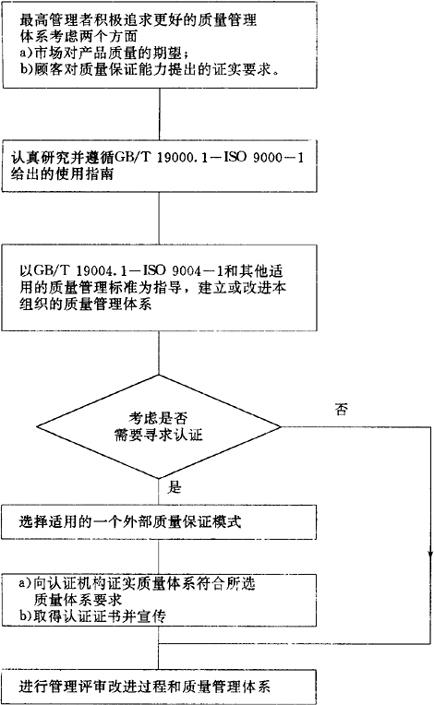 (3)使用语气和标准性质不同 由于三个质量保证标准是适用于合同情况下的质量体系,使用时可以将适用的一个标准直接在合同中引用,成为顾客与供方之间的质量保证协议。因此,这三个标准使用的是合同语气:“供方应……”,例如,“供方对顾客提供的产品应建立并保持验证、贮存和维护的形成文件的控制程序”;“供方应对每项设计和开发活动编制计划”。合同是具有约束力的,一旦某一个质量保证标准被特定的合同所引用,则该标准中所有规定要求都成为约束性的要求,供方和顾客都必须遵守并执行,否则就是违反合同。 GB/T19004.1-ISO9004-1是作为质量管理指南而使用,是指导性的文件,在任何情况下,对任何方面都不具有约束的性质。正因如此,该标准使用指导的语气,有些内容是讲解,例如产品寿命周期的各个阶段,质量成本方法、过程成本方法等。大部分规定是质量管理实践的经验,可供组织在建立并实施质量体系时结合具体情况采用。 4.为建立质量体系选用标准的两种途径 一个组织为了内部质量管理的需要建立质量体系时应如何选择和使用ISO9000族,对这一问题,GB/T19000.1-ISO9000-1(1994版)作了重大修改,修改后规定有两种同样适用的途径,称之为“管理者推动”和“受益者推动”。前一种途径是当初制定ISO9000系列国际标准时那些专家们的想法(当时并没有“管理者推动”这一说法),但是在ISO9000系列于1987年3月发布之后,绝大多数的组织却采用了另一种途径建立他们的质量体系(1994版的标准定名为“受益者推动”)。实践证明,这两种途径都是可行的。现将这两种途径的特点和实践步骤简述如下。 (1)管理者推动 此种途径的特点是,最高管理者处于主动状态,质量意识更强,自觉地要搞好质量管理,积极建立并实施质量体系,建立质量体系的做法是,首先以GB/T19004.1-ISO9004-1和GB/T19004-ISO9004其他适用的分标准为指导,建立一个能提高供方质量成就的质量体系。接着,作为一种预备措施,在任何顾客要求之前尽可能地寻求认证,为此,供方能使用三个质量保证标准中适用的一个,证实其质量体系的适宜性。图8.3.3-2是按管理者推动建立质量体系的实施步骤。