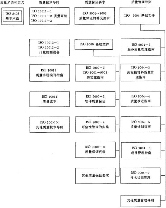 图13.3-4 ISO9000族 注:上述有些标准目前还处于草案阶段。 图13.3-4是当前已发布或拟发布的ISO9000族的有关标准(表中未列入ISO9001~ISO9003质量保证标准),现分别简述如下: 1.质量管理和质量保证词汇 这部分内容在13.3.2中已介绍,在此不再赘述。 2.质量技术导则 为了有计划,成体系地制定质量管理和质量保证的标准,ISO/TC 176把国际标准从ISO10001~10020之间的20个号留作为质量技术导则方面标准的编号,称这类标准为“一万系列”,目前已正式发布了两套标准:ISO10011《质量审核导则》共3个标准,世界上包括我国在内的许多国家陆续开始用这套标准对企业质量体系进行审核;ISO10012《计量测试设备的质量管理》,是从质量管理的角度,对计量测试提出一系列要求。计量测试设备的质量管理并不要求企业承担额外的负担,它是从保证质量出发而开展的一系列工作,不但包括了传统计量管理范围的全部计量器具,还包括了从产品设计、制造装配到维护所需的全部测试实验仪器、辅助工具卡和计算机软件。这类标准除了ISO10011和ISO10012外,还将包括《质量手册编写指南》、《质量成本管理导则》等方面的质量技术标准。 3.质量保证要求 这一类标准是以ISO9000标准为基础,也可理解为是ISO9001-9003质量保证要求的扩展,这类标准主要包括: (1)ISO9000-2《ISO9001~9003 的实施指南》。该标准不是ISO9001~9003的补充文件,而是为质量保证标准中各条款的实施提供指南。 (2)ISO9000-3《软件质量保证》。软件是指信息技术中的计算机软件、程序等。软件产品质量是指其满足给定需求的软件性能和组合特性。软件在使用过程中往往需要原设计人员的现场调试和功能再扩展,软件的维护也比硬件产品的维护更加特殊,维护失效可能导致系统的瘫痪,这些使得软件生存周期的质量管理变得至关重要。该标准对软件质量保证的要求作出了规定。 (3)ISO9000-4《可信性管理的实施》。可信性是用以描述可用性及其影响因素:可靠性、维修性和维修保障性的一个集合术语。可信性是许多产品最重要的性能特征之一。本国际标准为可信性大纲管理提供指南。 (4)ISO9000-x《质量保证代表》。在复杂产品的合同中,有时需明确一名质量保证代表,该标准对质量保证代表的职责和权限,以及质量保证代表的资格作了规定。 4.质量管理导则 ISO9004《质量管理和质量体系要素——指南》是具有普遍指导意义的质量管理基础标准。在ISO9000族“质量管理导则”类的其它标准,就是以ISO9004为基础派生出来的,目前这类标准主要包括: (1)ISO9004-2《服务质量管理指南》。服务型产品的特性有别于其它生产型产品的特性,服务型产品特性包括人员、等待时间、交付时间、舒适、卫生、可靠性以及直接供应给最终顾客的传递方面。顾客的评价,通常是衡量服务质量的客观标准。该标准描述了适用于所有形式的服务型产品的概念、原理和质量体系要素。 (2)ISO9004-3《流程性材料质量管理指南》。当产品(最终的或中间的)是由固体、液体、气体或其组合并通常以散装系统如管道、桶、袋、罐、盆等形式交付时,称流程性材料。对于流程性材料,首先关心的是过程(工序)控制。本标准是为适应流程性材料的特点,为生产流程性材料企业的质量体系的建立提供指南。 (3)ISO9004-4《质量改进指南》。争取使顾客满意和实现持续的质量改进是一个组织实施管理所追求的永恒目标。组织中的每个成员均应认识到每个过程的效率和效果都能通过质量改进进一步提高。本国际标准为一个组织持续地进行内部质量改进提供了指南和方法。 (4)ISO9004-5《质量计划指南》。质量计划与质量手册不同,它是针对某一产品、项目或工程而制定的,一般用于复杂产品并作为质量手册要求的补充。本国际标准为供、需双方在制定、审核、认可和修订质量计划时提供指南。 (5)ISO9004-6《项目管理指南》。任何新产品的研制、旧产品的改进、工序、设备、行政任务只要满足下列条件都可称为项目:授命一个人全权负责;由一个团组完成;在一个确定的时间内结束;有一个独特的目标;项目结束后得出一套完整的文件资料。采购、设计、市场调研、生产制造、销售可作为一个项目,每个项目均可分为7个阶段:概念、概念的规划(可行性)和项目的评估、设计、执行、正式运行、交付、总结记录。项目管理的质量管理导则是根据项目管理的基本理论,把每项质量活动按7个阶段加以分解,提出需要控制的因素。本国际标准为项目管理提供指导。 (6)ISO9004-7《技术状态管理指南》。技术状态管理是一门管理学科,是工程项目管理的一个主要工具,是质量体系的一个组成部分。本指南的基本目标是在所有工业界内统一技术状态管理方法,以增加对技术状态管理的共同理解,增进国内、国际间的合作并促进组织应用技术状态管理来改进他们的工作。 【参考文献】: [1]刘源张主编,质量管理和质量保证系列标准宣传教材,中国标准出版社,1992。 [2]中国质量管理协会编着,质量管理和质量保证教材,上海科学技术出版社,1990。 [3]张公绪主编,质量专业工程师手册,企业管理出版社,1994。 [4]中华人民共和国国家标准,GB/T19001~19004-1994。 [5]李春田主编,标准化概论,中国人民大学出版社,1990。 [6]王立吉主编,计量质量保证方案,中国计量出版社,1992。 [7]刘定华主编,产品质量法概论,湖南出版社,1992。 [8]