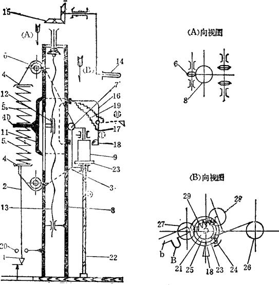 图4-5 NTL-75型坚实度仪原理图 1.柱塞 2.联结杆 3.滑架 4.支架 5a,5b.测力弹簧 6、7.滚轮 8.管形支柱 9.记录纸带 10.靠板 11.套筒 12.螺母 13.螺杆 14.摇柄 15.伞形齿轮 16.托架 17.杠杆 18.记录笔 19.弹簧 20.导向滚轮 21.主动轮 22.轴 23.棘轮圆盘 24.棘爪 25.圆盘 27.小轴 28.辅助轴 29.弹簧 1.仪器的构造和工作原理本仪器(图4-6)主要由三个部分组成:管形支柱、可沿支柱上下移动的滑架及圆锥楔形柱塞。滑架上有测力弹簧(有三组弹簧可供选择)及记录机构,随着柱塞压入土中所遇的阻力,测力弹簧的压紧或张开在记录纸上即记下弹簧变形量与圆锥楔入土深度的关系曲线。 2.测定步骤 在使用仪器前,先要选择适应土壤阻力的弹簧进行仪器标定,就是作压力(kg)和弹簧变形量(mm)的相关曲线。如(图4-6),横座标表示力的变形量H,纵座标表示作用于柱塞的力P,绘成的坚实度计曲线,即可用作查算土壤坚实度测定时记录下来的线图值。测定时,仪器放在预先选好的地段,这时要清除圆锥柱塞下方地面上的残茬,避免裂缝、特殊土块和瓦片等。仪器放上后,为不使它翘起来,两个人站在木质基座上(如土壤坚实度不大,一人也可),固定好记录纸和调整记录笔的位置,测定即可开始。