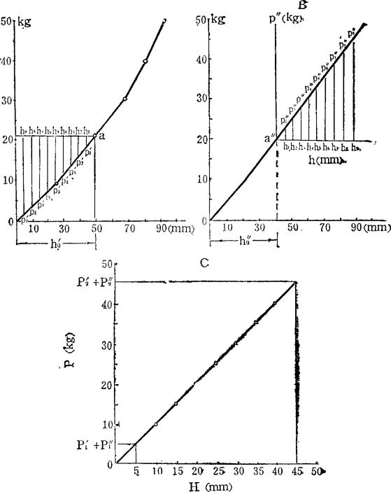 图4-6 弹簧标定曲线 A.上弹簧标定曲线 B.下弹簧标定曲线 C.综合标定曲线 摇转手柄,使柱塞插入土壤中,固定在滑架上方的指针沿着管子上的刻度移动,由此可看出柱塞入土的深度。本仪器的量程可达土层30cm。 把手柄反向旋转,柱塞即从土壤中拔出,然后用相同的方法进行下一次土壤坚实度的测定。 用这种坚实度仪测定土壤的坚实度,在1m2的面积上不应少于5次重复,测点分布于正方形的四角和它的中心(即梅花形)或在有代表性的地段沿着直线方向每隔1m取1点。将所得的线图结果记下号码、测定日期、土壤、利用情况和地点等。由于土壤的坚实度与含水量密切有关,故应同时测定相应土层中的含水量。 3.结果计算 测定的结果如图4-7所示。
