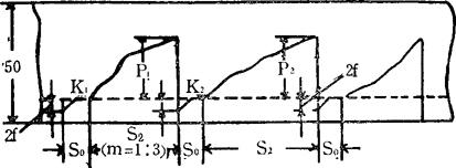 图4-7 土壤坚实度曲线记录图 当柱塞开始向下移动到与土壤相接触之前(或指针与零度线相合之前)通过的距离为S,即是记录笔在图上画出的S0,这个部分与原始位置偏斜了2f,这个值相当于作用在弹簧上的仪器重量及转动部分所产生的摩擦力。K1、K2、K3是柱塞与土壤刚接触时画下的线段,把它们连接起来可作为零线,以零线为基点,用求积仪测量图的面积,以深度除,即得平均纵座标。 按照下列公式计算土壤的平均坚实度P(kg/cm2);