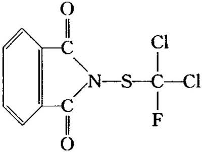 | 释义 | N-(氟二氯甲基硫代)邻苯二甲酰亚胺 【结构式】: