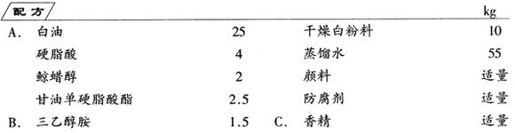 分别将A中和B中的全部各组分混合,加热至75℃,得A组分和B组分。在搅拌下将B组分加入A组分中,充分混合均匀,待温度降至35℃时加入C组分香料,混合均匀,即成粉底霜。