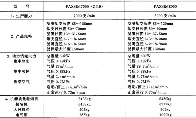 | 释义 | PASSIM卷接机组 PASSIM卷接机组是在SUPER9卷接机组的基础上改进的机组。有PASSIM7000、PASSIM8000、PASSIM10000三种机型,属国际水平的设备。 PASSIM7000卷接机组已国产化,其型号为ZJ19(原YJ19/YJ29)卷接机组。 1.结构特点 (1)PASSIM卷烟机结构特点: ①采用了新式粗钉滚筒料斗,代替了传统的针条提升带结构,对烟丝的适应性显着提高。 ②同样采用了双风分除杂结构,能完全除去烟丝中的梗签与梗块。采用了吸风罩,显着降低了烟丝堵塞现象,重量偏差小。 ③平准器劈刀盘用平均重量控制的方法自动调整,并可由控制盘上的专用开关操纵,根据烟支长度变化,改变烟条的紧头位置。 ④大风机装在卷烟机后面的消音箱内,并与吸风室直接连接。小风机在料斗下部,串联式的空气环路,使空气均匀分配在整个装置的宽度范围内。 (2)PASSIM接装机结构特点: PASSIM接装机的结构与PA9型接装机相似,主要特点是: ①在制品传递准确,接装质量好、浪费少。 ②所有鼓轮和阀容易拆除,清理,维修方便。 ③接装纸进料系统增设储存库,纸的张力一致,可以消除加速时接装纸不连贯的现象。 2.主要技术参数 见表9-3-3所示。 表9-3-3 PASSIM卷接机组主要技术参数