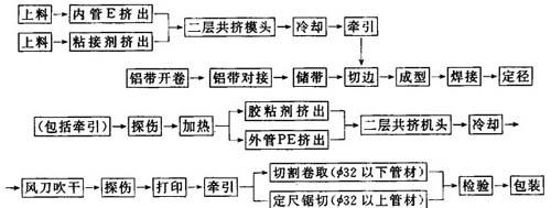 图14-17 复合生产线工艺流程图 (二)SJLS-60型 生产外径为14~63mm的管材,生产速度为3~20m/min,采用一步法联线生产,生产线总长60m。生产工艺流程见图14-18。