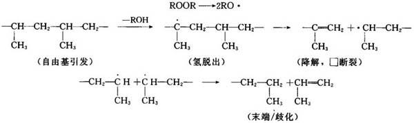 含有过氧化物的PP在熔融状态下,通过一系列的链引发链断裂、链转移和链终止的自由基反应而发生降解。简化的反应如下。
