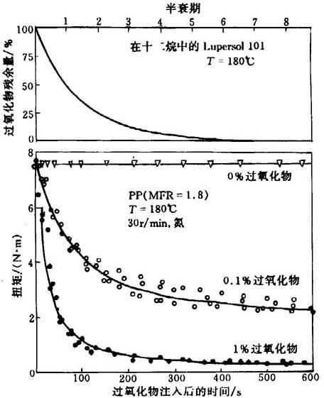 现在,具有较大工业实用价值的过氧化物是过氧化二异丙苯(DCP),其用量在0.01~1phr之间,DCP在179℃时的半衰期(t1/2)为1min(1),工业生产中就将179℃作为DCP的分解产生自由基的温度,时间一般为8~10min(即DCP半衰期的8~10倍时间)。在实验室的专用密炼机进行试验,可得到转矩-时间曲线。通常认为,转矩-时间曲线等效于粘度-时间曲线或相对分子质量-时间曲线。图18-4是N2保护下得到的数据。
