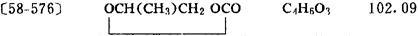 [碳酸丙二醇酯;4-甲基-1,3-. TW 62013 性状 无色粘稠状液体。能与醇、醚、苯相混溶,微溶于水。bp 239-242℃;Fp 270℉(132℃,闭杯); 注意事项 该品易燃。对眼睛及皮肤有刺激性。应防止儿童接近。入眼睛时应立即用大量水冲洗后请医生诊治。
