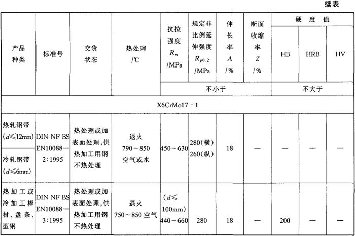 注:①允许含有0.60%的Ni。 ②棒材、盘条、型钢以及相应的半成品,硫的最大含量为0.030%;用于切削加工的钢材,建议硫含量控制范围为0.015%~0.030%。 (2)力学性能 表3-106 主要产品热处理后的室温力学性能