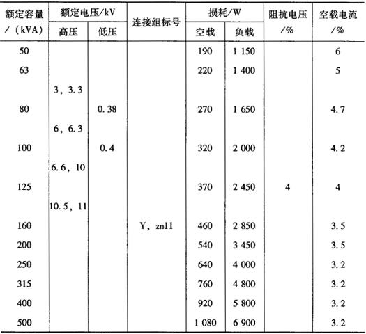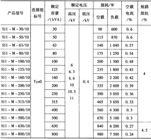 S11M系列30~800kVA、10kV级卷铁芯无励磁调压全密封变压器技术数据见表4-9。 表4-9 S11M系列30~800kVA、10kV级卷铁芯无励磁调压全密封变压器技术数据