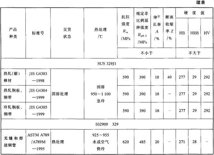 注:①ASTM标准试样标距为Lo=50mm。 (3)主要特性和用途 此钢屈服强度高,几乎是奥氏体型不锈钢的2倍。在海水中具有较好的耐点蚀和缝隙腐蚀能力,抗氧化性能也较好。在含氯化物的水介质中有较好的耐应力腐蚀性能。 用于制造耐海水腐蚀的设备,用工业水作为冷却介质的热交换器设备等。 |