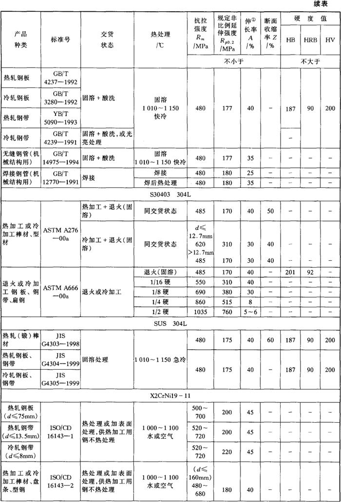 注:①ASTM标准试样标距为Lo=50mm。 (3)主要特性和用途 奥氏体型超低碳不锈钢,比0Cr19Ni9钢的碳含量还低,所以更耐晶间腐蚀。可以用通用的各种不锈钢焊接工艺进行焊接,焊接后可以不进行热处理。 用于制造化工、石化、石油、化肥、动力等工业中焊接后不进行热处理的设备、容器、管道以及各种零部件等。 |