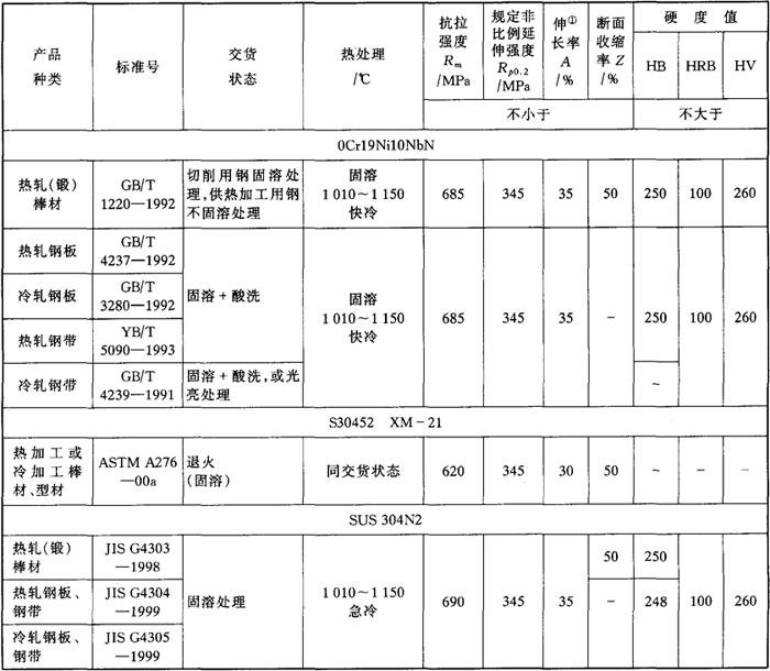 注:①ASTM标准试样标距为Lo=50mm。 (3)主要特性和用途 在0Cr19Ni9钢的基础上加入0.15%~0.30%的氮和≤0.15%的铌冶炼制成。氮的加入,显着提高了钢的强度;铌的加入,对改善钢的耐晶间腐蚀的能力具有良好的效果。 适宜制造强度要求高且耐晶间腐蚀性能又好的焊接设备和部件。 |