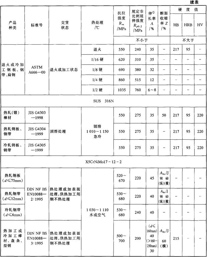注:①ASTM标准试样标距为Lo=50mm。 (3)主要特性和用途 在0Cr17Ni12Mo2钢中加入0.10%~0.22%的氮炼制而成。由于氮在钢中的固溶强化并稳定奥氏体组织的作用,使其在不降低塑性的情况下,强度得到提高,从而可以减小制件的厚度。 用于制造既要求耐腐蚀性不低于0Cr17Ni12Mo2,又要求具有较高强度的零部件。 |