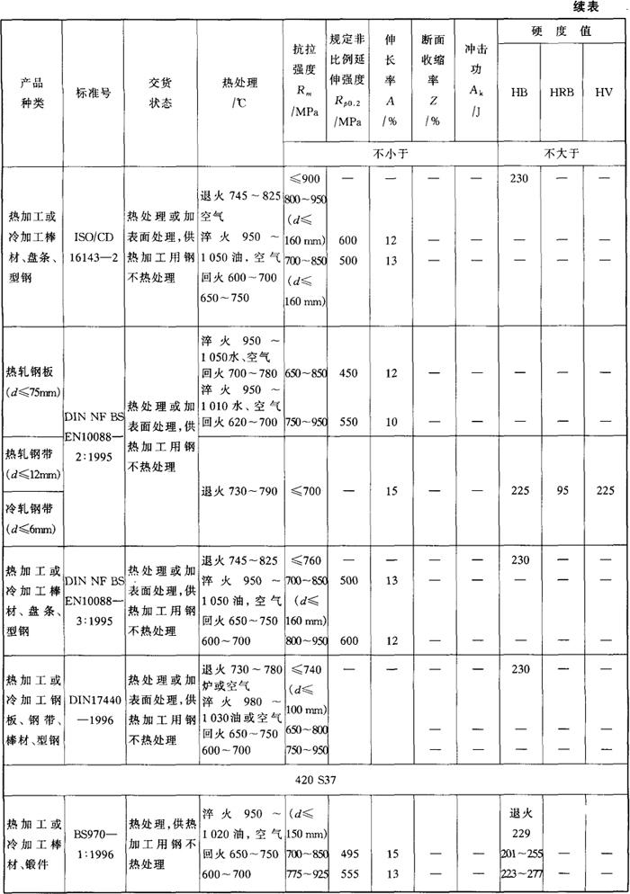 注:①允许含有≤0.60%的Ni。 ②棒材、盘条、型钢以及相应半成品,硫含量最大为0.030%;用于切削加工的钢材,建议硫含量控制范围为0.015%~0.030%。 (2)力学性能 表3-132 主要产品热处理后的室温力学性能