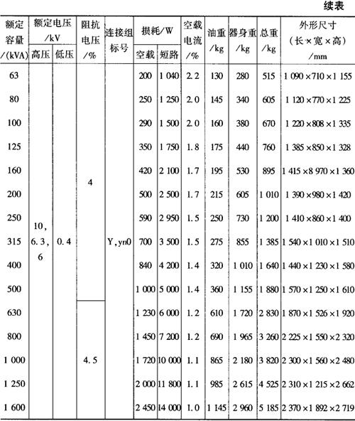 表4-7 SZ9系列(35kV)有载调压电力变压器技术数据
