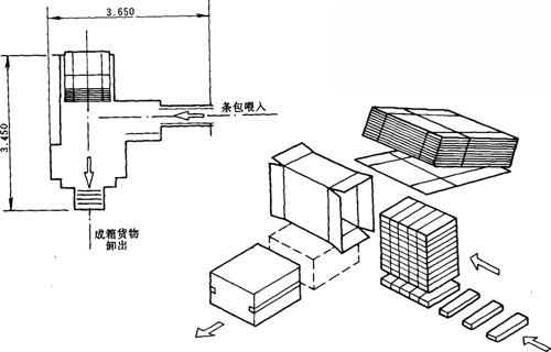 | 释义 | SBNR型自动装箱机 1.结构特点 (1)该机是全自动的,可按要求的包装排列形式将条包烟堆叠起来,送入预先制好的纸箱中,纸箱可用塑料胶带或热熔法封口。为避免条包烟折皱变形,两侧和底部均有传送器,以保证纸盒可靠喂入。纸箱通常是由独立的真空吸取器从储料斗内吸出,也可用特殊的纸箱吸取装置处理变形和实心纸板箱。 (2)码垛和装填装置以机械方式通过曲轴机构、电磁离合器和制动器进行工作,以柔顺地处理产品。用探测器检查码垛条包是否排列正确。直观显示板可显示机器各主要工位状况。 2.主要技术参数 规格:每小箱5000支或10000支。 速度:每分钟2小箱(10000支/小箱)或4小箱(5000支/小箱)。 封口:自粘胶带(乙烯胶带),热熔法,热熔法和自粘胶带并用,或纸箱不封口。 号码打印:打印6位数字,字符最大高度为30mm。 标准型SBNR装箱机。 机器质量:2300kg。 装机功率:6.26kW。 电力消耗:5kW。 压缩空气:6×105Pa,40L/h。 真空:8×104Pa,55m3/h。 3.外形尺寸及安装图示 见图9-4-36及图9-4-37所示。