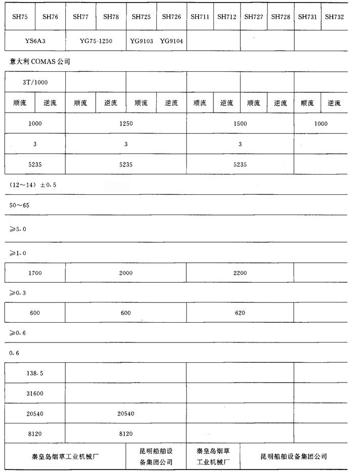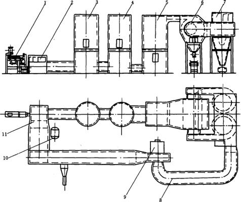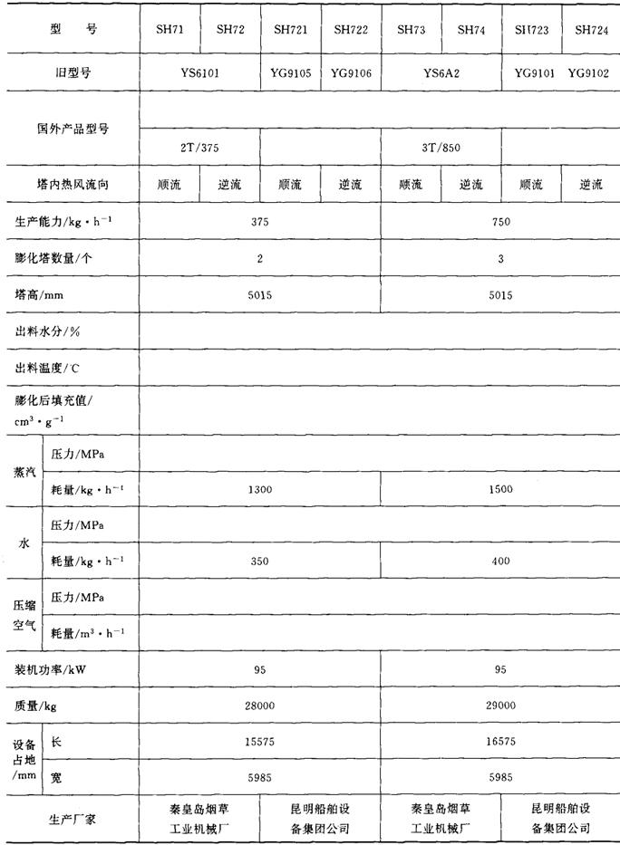 图9-2-30 SH型塔式梗丝膨化装置平面布置图 1-振动输送机 2-加热器 3-第-膨胀塔 4-第二膨胀塔 5-第三膨胀塔 6-切向分离器 7-旋风除尘器 8-热风管道 9-风机 10-水箱 11-混合箱 3.外形尺寸及安装图示 SH型塔式梗丝膨化装置的设备外形及安装图示见图9-2-30所示。 4.生产厂家 见表9-2-30。 表9-2-30SH型塔式梗丝膨化