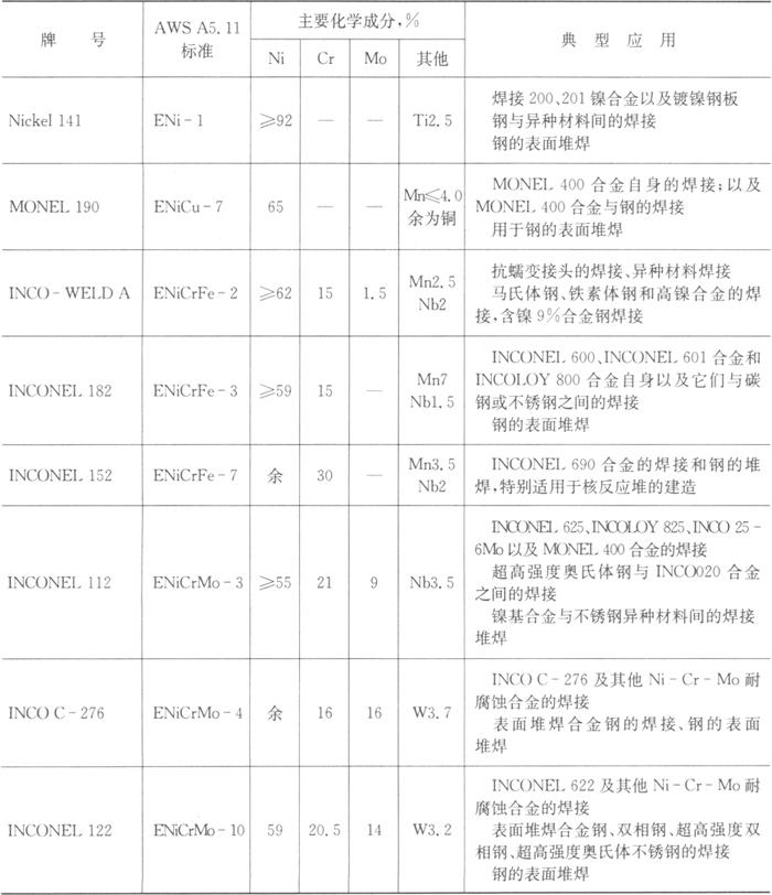表5.7-1 SMC国际超合金集团生产的主要镍合金焊条