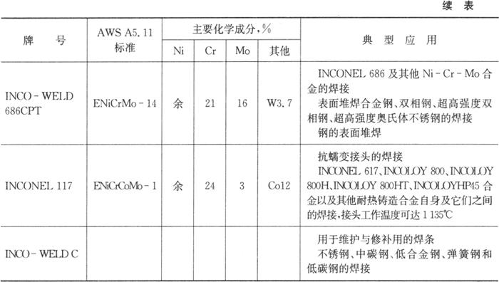SMC国际超合金集团生产的主要焊条焊丝的化学成分及典型应用见表5.7-1、表5.7-2、表5.7-3、表5.7-4、表5.7-5、表5.7-6和表5.7-7。