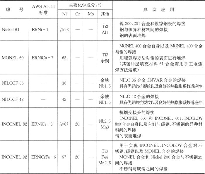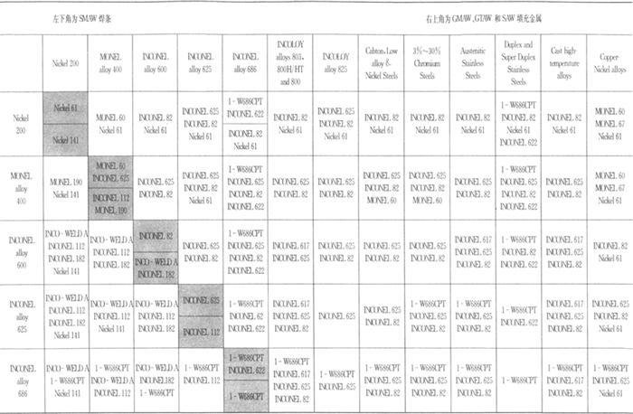 表5.7-7 镍基合金焊接材料推荐表