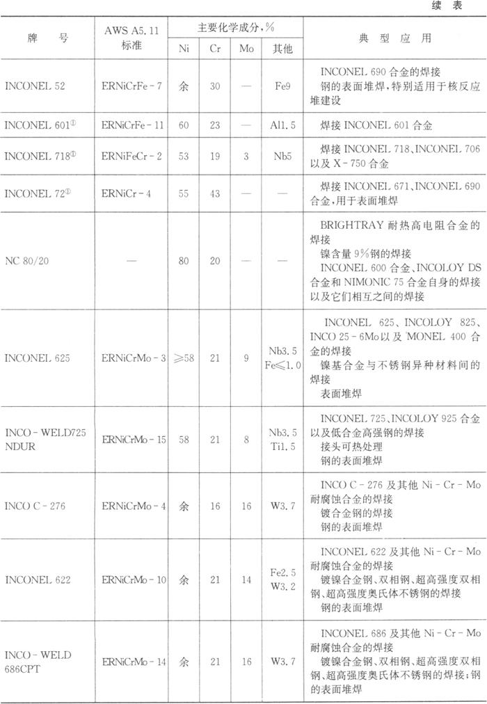表5.7-2 SMC国际超合金集团生产的主要镍合金数焊丝和填充丝