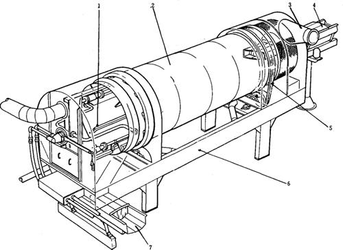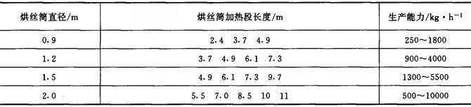 图9-2-24 TC型及D型烘丝机示意图 1-翻丝板 2-滚筒 3-热风系统 4-进料振槽 5-传动系统 6-支架 7-出料振槽 (2)可通过调节蒸汽压力或调节过热循环水温度而控制烟丝的干燥速度。 (3)当排汽即将饱和时,为防止出现冷凝水,可从烘丝筒的喂料段输入热空气。该机可手动操作,也可自动操作。 2.主要技术参数 (1)生产能力:见表9-2-22所示。 表9-2-22TC型及D型烘丝机生产能力