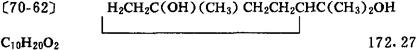 [松脂馏油;萜松油;1,8-萜二醇;4(1羟基1甲基乙基)1甲基环己醇;4-(1-Hydroxy-1-methylethyl)-1-methyl cyclohexanol;Terpinol;Dipenteneglycol;ρ-Menthane-1 8-diol;4-Hydroxy-α,α,4-trimethyl cyclohexane methanol] 性状 无色至微黄色略带粘性的液体或透明结晶。系三种异构体的混合物能溶于醇和醚几乎不溶于水mp 12-14℃;bp 214-224℃;d 0.931-0.935;