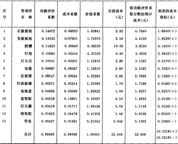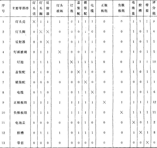 4.产品功能评价 该矿灯由125个零件组成。其中47个零件是主要的,已由矿灯成本ABC分析图作了分析。现主要对这47个零件所组成的13个关键零部件作功能评价。由9位工程技术人员参加,评价方法是应用01评分法。将功能评价作为评分评定,各自分别评定,然后再汇总计算平均值。13个主要零部件的评价结果,以功能评价系数来表示。评价表及评价综合统计表分别见表6和表7。现以第三号评价者的评定为例,得出结果,见表7。 表6