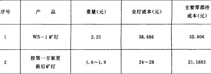 (6)重量、成本预测汇总: 按第一方案更新后矿灯的预测数据整理。 Ⅰ矿灯重量、成本与按第一方案更新后矿灯重量、成本预测对比见表9: 表9