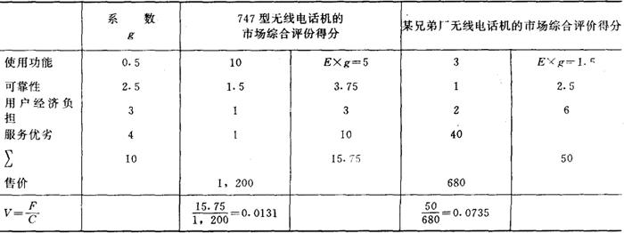 | 释义 | XX型无线电话机的价值分析 某厂生产的X型无线电话机为沿海渔业通讯工具。为了扩大销售量和替工厂创造更大的经济效益,给用户提供更多的服务和利益,他们对这种无线电话机进行价值分析。 一、从市场及用户价值观念调查着手开展价值分析 1.市场调查 通过对一些省市的用户访问及改善服务,发现该类无线电话机的市场占有率只有14.8%,而该厂747机仅为2.3%;这就是说,还有85.2%的广大市场尚处在空白状态(不包括未来的潜在市场)。 2.用户价值观念调查 根据调查结果,对该厂X型无线电话机和兄弟厂产品的市场评价如表1。 表1