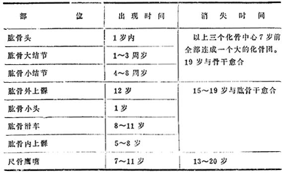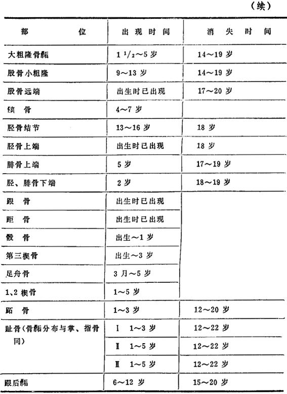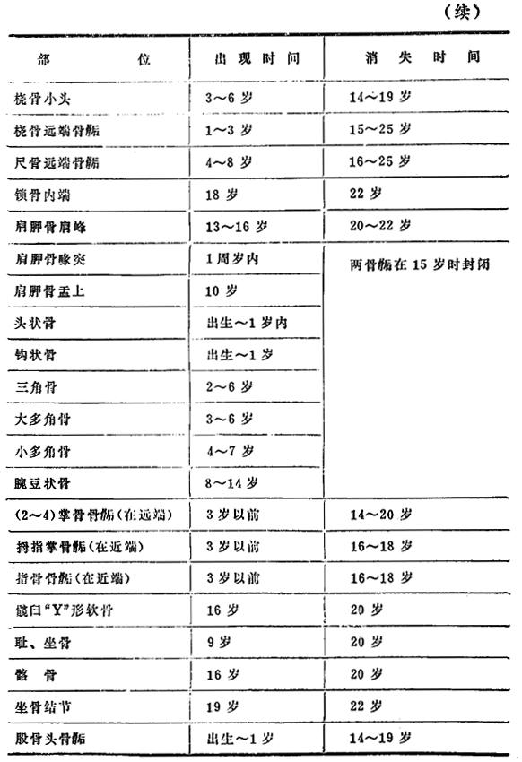 | 释义 | X线检查 一、正常骨与关节的X线解剖 (一)骨膜:正常骨膜在X线下不显影。如显示有骨膜影像,则表示为病理现象。 (二)皮质骨:皮质骨在X线下显示为深白色均匀一致的影像,骨小梁纵行排列而连续,中段最厚,向两端逐渐变薄,在四肢长管骨的肌肉附着部,可见有骨突或骨脊影像。 (三)松质骨:在X线下显示为细致、整齐,呈网状的骨纹理结构。 (四)骨髓腔:管状骨髓腔,呈连续的比较均匀的条状透明区。 (五)骨骺线:骨骼在生长发育期(骨骺愈合以前)的长骨端,可见有宽窄不等的骨骺线。X线下为一横贯骨干端的条状透明影像,密度均匀,两侧对称。个别人,两侧骨骺发育可不对称。 (六)关节:在正常情况下,关节的软骨面、关节囊、韧带均不显影,所见到的关节间隙,为构成关节的骨端骨皮质,实际的关节间隙,较X线所显示的关节间隙为窄。小儿的关节间隙较成人宽。临床上可以利用关节间隙的增宽和变窄、关节面是否光整,来判断某些疾病的存在与否。 总之,熟悉正常关节间隙及各部骨骺出现和消失时间,对临床诊断具有非常重要的意义,特附表如下。 正常骨骺化骨中心出现和消失时间表
