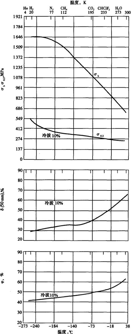 图1-34 Y1Cr18Ni9钢冷作硬化特性 (5)低温力学性能 Y1Cr18Ni9的低温力学性能见图1-35和图1-36。