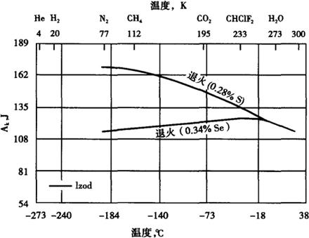 图1-36 Y1Cr18Ni9冷加工态的低温力学性能 Y1Cr18Ni9和YY1Cr18Ni9Se的低温压缩强度和冲击韧性见图1-37和图1-38。